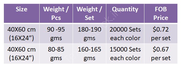 Exclusive Offer # 3087- Cotton Terry Kitchen Towel Set of 2 Stock Available at Heavy Discounts ⭐Customized packing available ⭐No defect Guaranteed. ⭐Fast and reliable shipping. ⭐Third Party Inspection Available ⭐FOB Price - $0.72 per set :- Size - 40X60 cm (16X24”) :- Weight / Pcs - 90 -95 gms :- Weight / Set - 180-190 gms :- Quantity - 20000 Sets each color ⭐FOB Price - $0.67 per set :- Size - 40X60 cm (16X24”) :- Weight / Pcs - 80-85 gms :- Weight / Set - 160-165 gms :- Quantity - 15000 Sets each color |