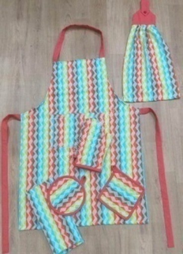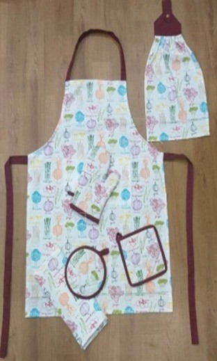 | Size | Apron 60x80; Gloves 18x31; Pot holder 18x18cms; Kitchen towel 45x65 cms |