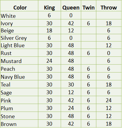 | Size | 270X225 , 225X225 , 165X225 , 125X150 cms |