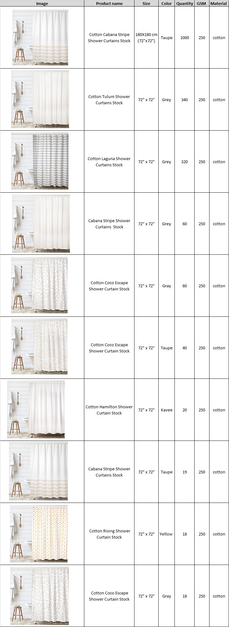Exclusive TS-0011# Cotton Shower Curtains Stock Available at Heavy Discounts ⭐Customized packing available ⭐No defect Guaranteed. ⭐Fast and reliable shipping. ⭐Third Party Inspection Available 👉 Quantity :- 1895 Pcs 👉 Size :- 180X180 cm (72"x72") 👉 Color :- Taupe, Kavee, Yellow ,Gray 👉 GSM:- 250