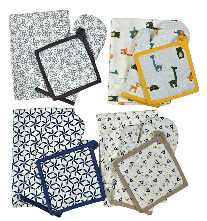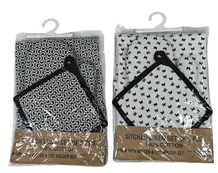 Exclusive Offer # 3191- 3 pc Kithen Set- Apron, Oven Mitt + Pot Holder Stock Available at Heavy Discounts ⭐Customized packing available ⭐No defect Guaranteed. ⭐Fast and reliable shipping. ⭐Third Party Inspection Available 👉 Quantity :- 3000 Sets 👉 Size :- Apron 60x80cms Gloves 17x28cms Potholder 17x17cms 👉 Color :- As per pic 👉 GSM:- 250-300 gms |