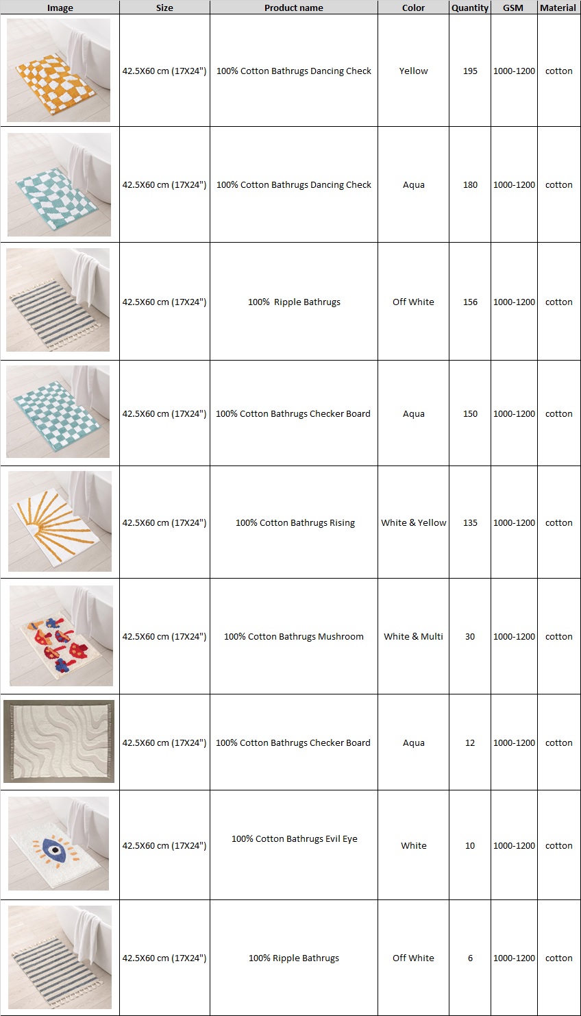 Product DetailsExclusive Offer # TS-001 – Bath Rugs 100% Cotton Stock Available at Competitive Prices Upgrade your product range with our premium-quality bath rugs made from 100% cotton, designed for superior softness, absorbency, and durability. Perfect for bathrooms, spas, hotels, and home use, these rugs provide comfort and safety with every step. Crafted using high-GSM cotton fabric, these bath rugs offer excellent water absorption, quick drying, and long-lasting performance. Their stylish designs and vibrant color options make them a perfect fit for modern interiors and retail collections. This is a ready stock of 874 pieces, available for immediate dispatch, making it an ideal choice for importers, wholesalers, and retail chains looking for high-demand products at attractive prices. ⭐ Customized packing available 👉 Quantity: 874 Pcs