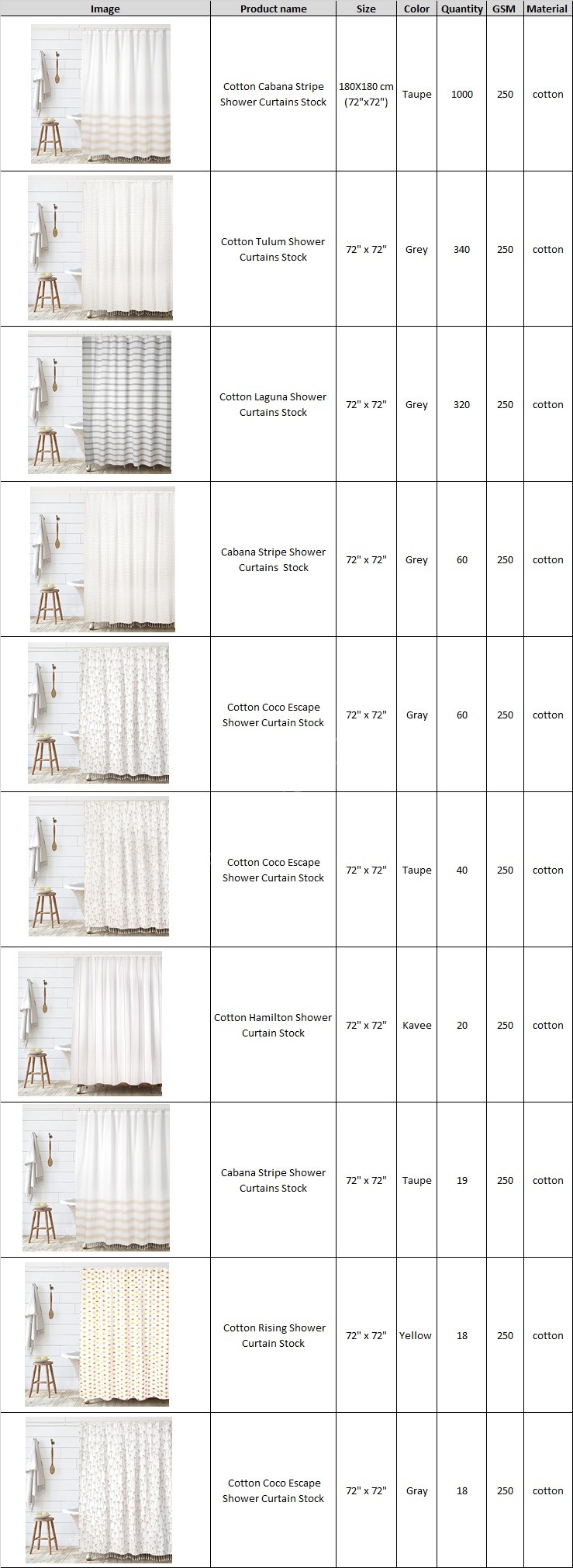 Exclusive TS-0011# Cotton Shower Curtains Stock Available at Heavy Discounts ⭐Customized packing available ⭐No defect Guaranteed. ⭐Fast and reliable shipping. ⭐Third Party Inspection Available 👉 Quantity :- 1895 Pcs 👉 Size :- 180X180 cm (72"x72") 👉 Color :- Taupe, Kavee, Yellow ,Gray 👉 GSM:- 250