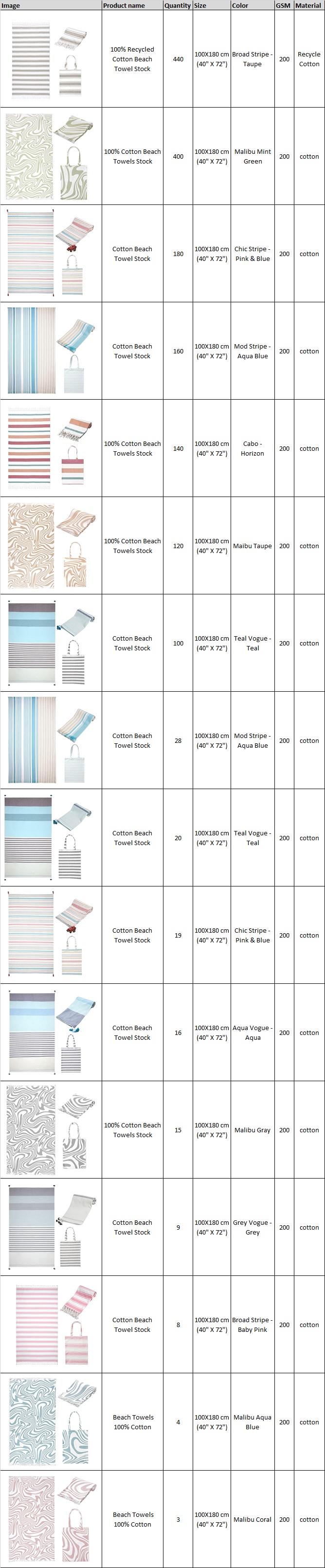 Exclusive TS-003# 100% Cotton Beach Towels Stock Available at Heavy Discounts ⭐Customized packing available ⭐No defect Guaranteed. ⭐Fast and reliable shipping. ⭐Third Party Inspection Available 👉 Quantity :- 1662 Pcs 👉 Size :- 100X180 cm (40" X 72") 👉 Color :- Taupe , Mint Green ,Pink & Blue , Aqua Blue , Horizon , Teal, Pink & Blue , ,Gray , Coral 👉 GSM:- 200