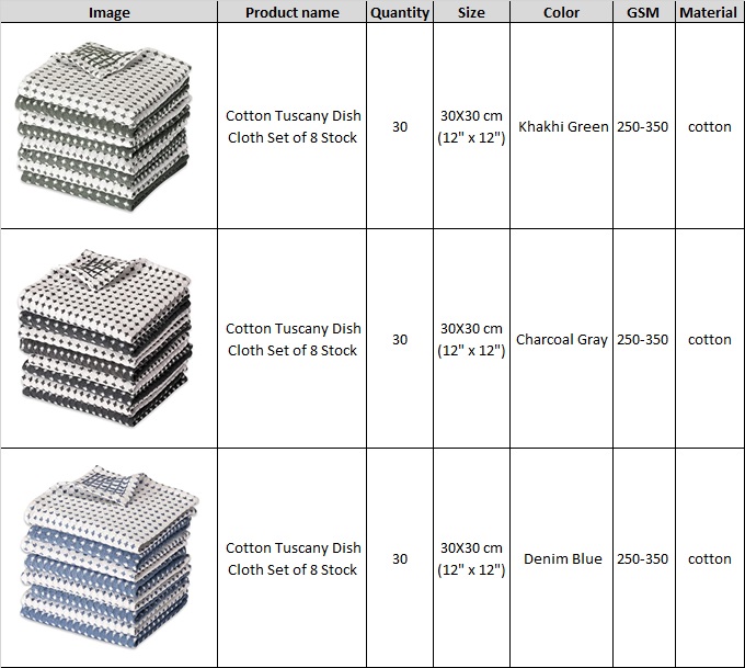 Exclusive TS-004# Cotton Tuscany Dish Cloth Set of 8 Stock Available at Heavy Discounts ⭐Customized packing available ⭐No defect Guaranteed. ⭐Fast and reliable shipping. ⭐Third Party Inspection Available 👉 Quantity :- 90 Pcs 👉 Size :- 30X30 cm (12" x 12") 👉 Color :- Khakhi Green , Charcoal Gray , Denim Blue 👉 GSM:- 250-350