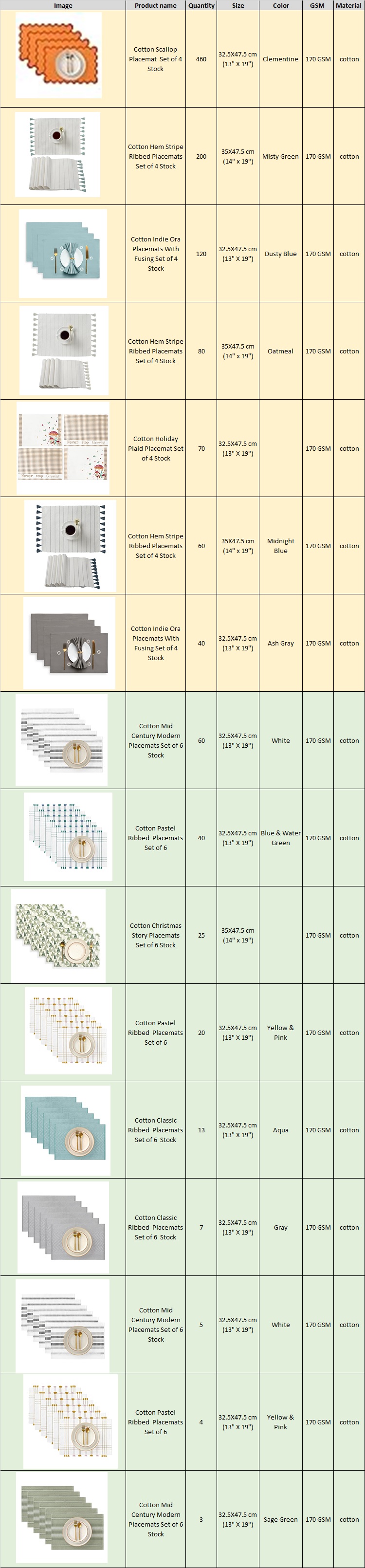 Exclusive TS-009# Cotton Placemat Set of 4 & Set of 6 Stock Available at Heavy Discounts ⭐Customized packing available ⭐No defect Guaranteed. ⭐Fast and reliable shipping. ⭐Third Party Inspection Available 👉 Quantity :- 1207 Pcs 👉 Set of 4 - 1030 Set of 6 - 177 👉 Size :- 32.5X47.5 cm (13" X 19") 35X47.5 cm (14" x 19") 👉 Color :- Clementine, Misty Green, Dusty Blue, Oatmeal, Midnight Blue, Ash Gray, White ,Blue & Water Green, Yellow & Pink, Aqua, Gray, White, Yellow & Pink, Sage Green 👉 GSM:- 170